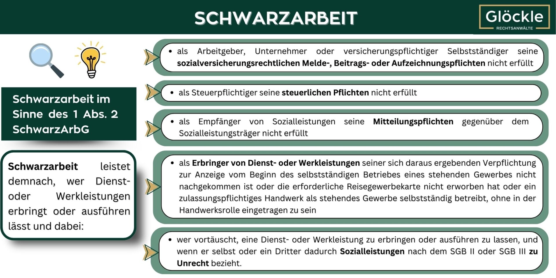 Im Schwarzarbeitsbekämpfungsgesetz wird definiert, was unter Schwarzarbeit zu verstehen ist. Schwarzarbeit liegt unter anderem vor, wenn Dienst- oder Werkleistungen ausgeführt werden und der Arbeitgeber, Unternehmer oder versicherungspflichtige Selbstständige seine sich auf Grund der Dienst- oder Werkleistungen ergebenden sozialversicherungsrechtlichen Melde-, Beitrags- oder Aufzeichnungspflichten nicht erfüllt (§ 1 SchwarzArbG).